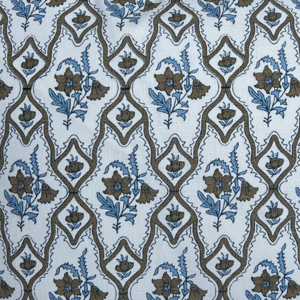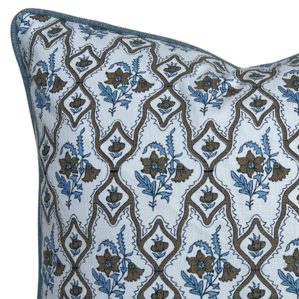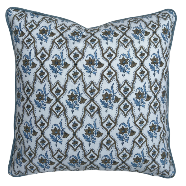 The August Pillow features a small block floral print in brown and soft blue on a white ground. The repeating lattice layout gives it a tailored, collected look that layers beautifully with solids, stripes, and larger florals. Finished with blue cording for a polished touch and hidden zipper. Feather down pillow insert included.