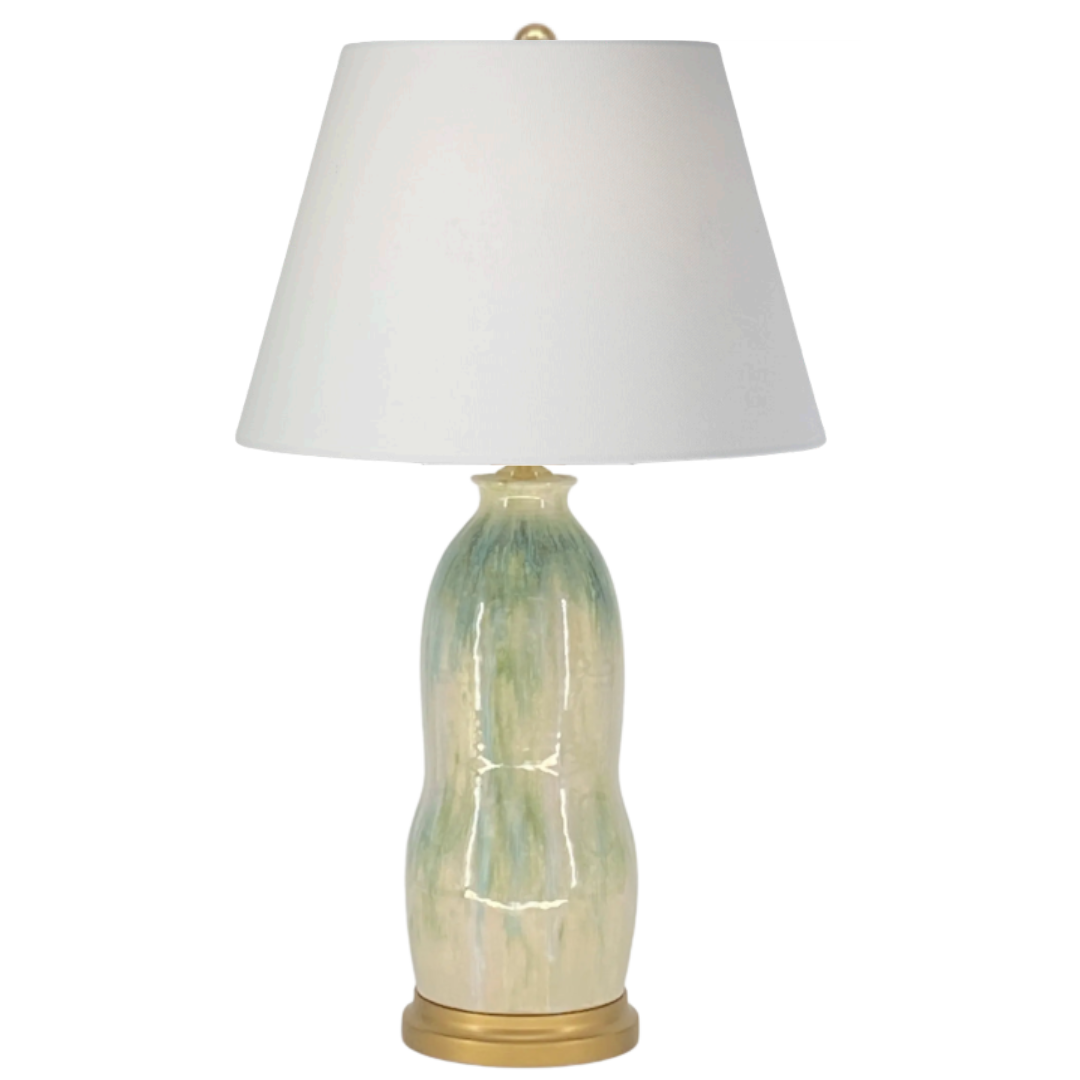 The Gourd table lamp by Charlie West combines a graceful silhouette with a softly layered glaze in Watercolor Green. Handcrafted and hand-glazed, each piece is one of a kind, with organic variations that highlight the artistry of studio pottery. Resting on a gold painted wooden base, this lamp brings a touch of elegance and subtle color to both modern and traditional interiors.