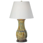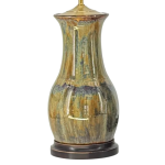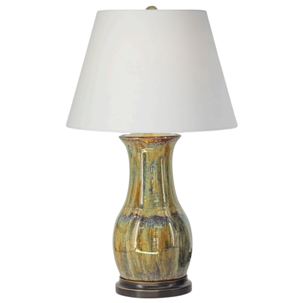 The Honey table lamp by Charlie West features a softly rounded silhouette finished in a richly layered Twilight glaze, blending deep, moody tones with natural movement. Handmade and one of a kind, each lamp reflects the character and subtle variation of true studio pottery. Set on a stained brown wooden base, it adds depth and warmth, making it a striking accent in both traditional and collected interiors.