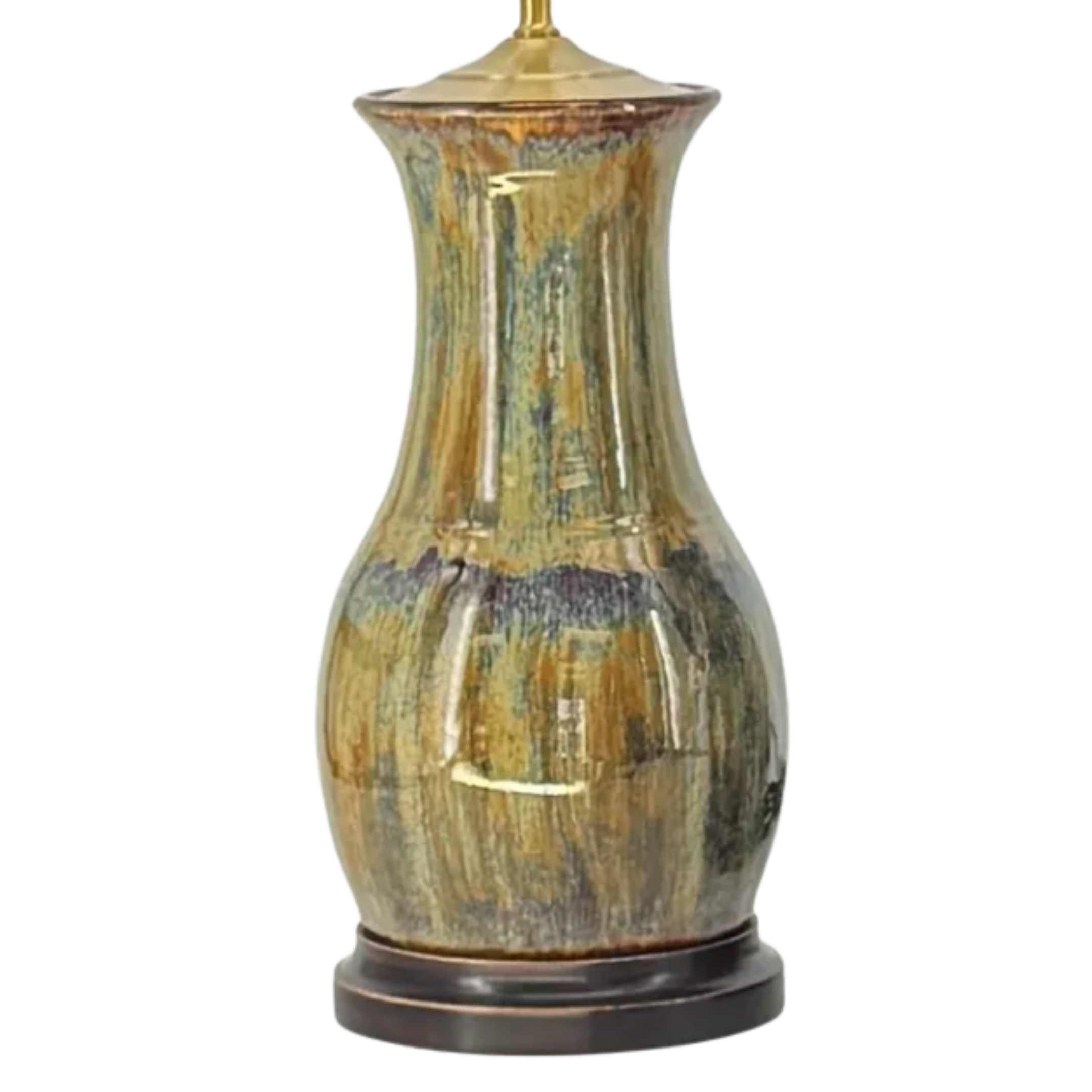The Honey table lamp by Charlie West features a softly rounded silhouette finished in a richly layered Twilight glaze, blending deep, moody tones with natural movement. Handmade and one of a kind, each lamp reflects the character and subtle variation of true studio pottery. Set on a stained brown wooden base, it adds depth and warmth, making it a striking accent in both traditional and collected interiors.