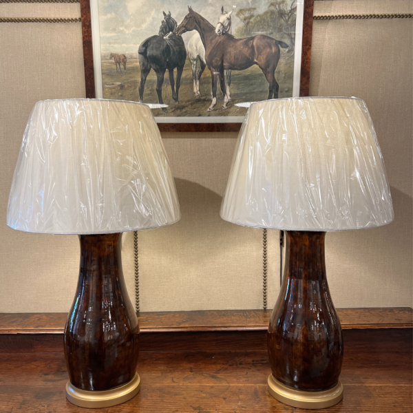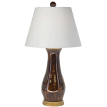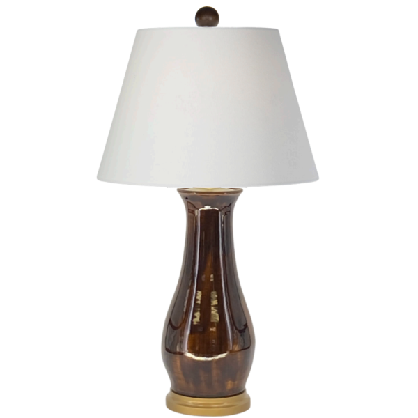The Renaissance table lamp by Charlie West showcases timeless craftsmanship with its rich, hand-glazed Cognac finish and classic silhouette. Each lamp is handmade and one of a kind, highlighting the artistry and natural variations of true studio pottery. Set on a gold-painted wooden base, it lends warmth and sophistication, making it a beautiful accent in both traditional and collected interiors.