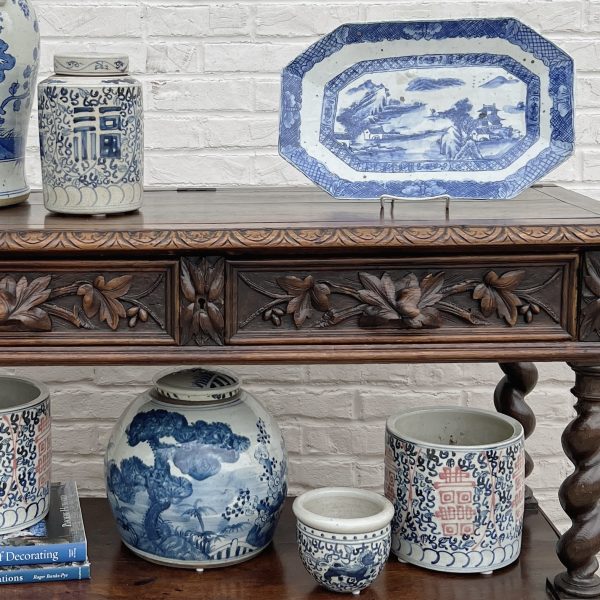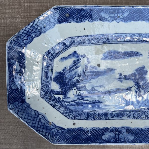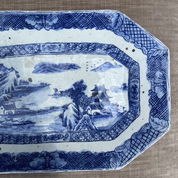 This decorative plate makes a big statement! Gorgeous blue & white porcelain plate decorated with a traditional village motif. Rectangular shape with cut corners.