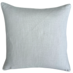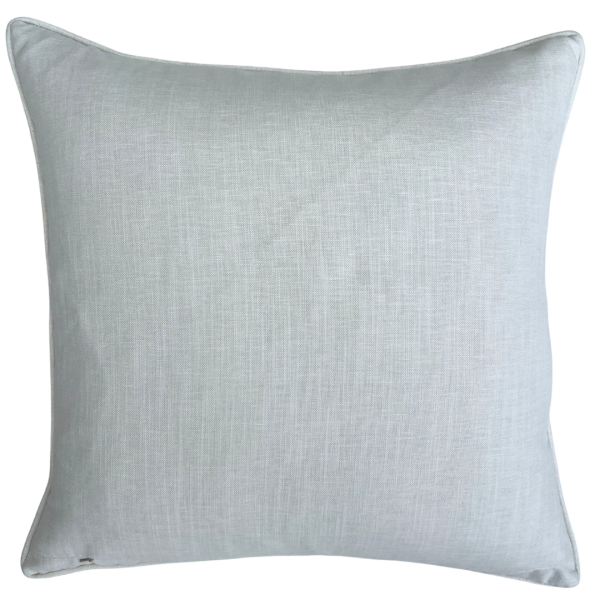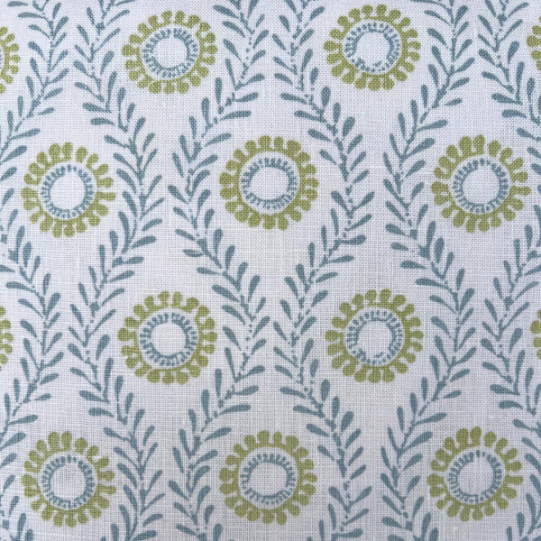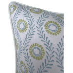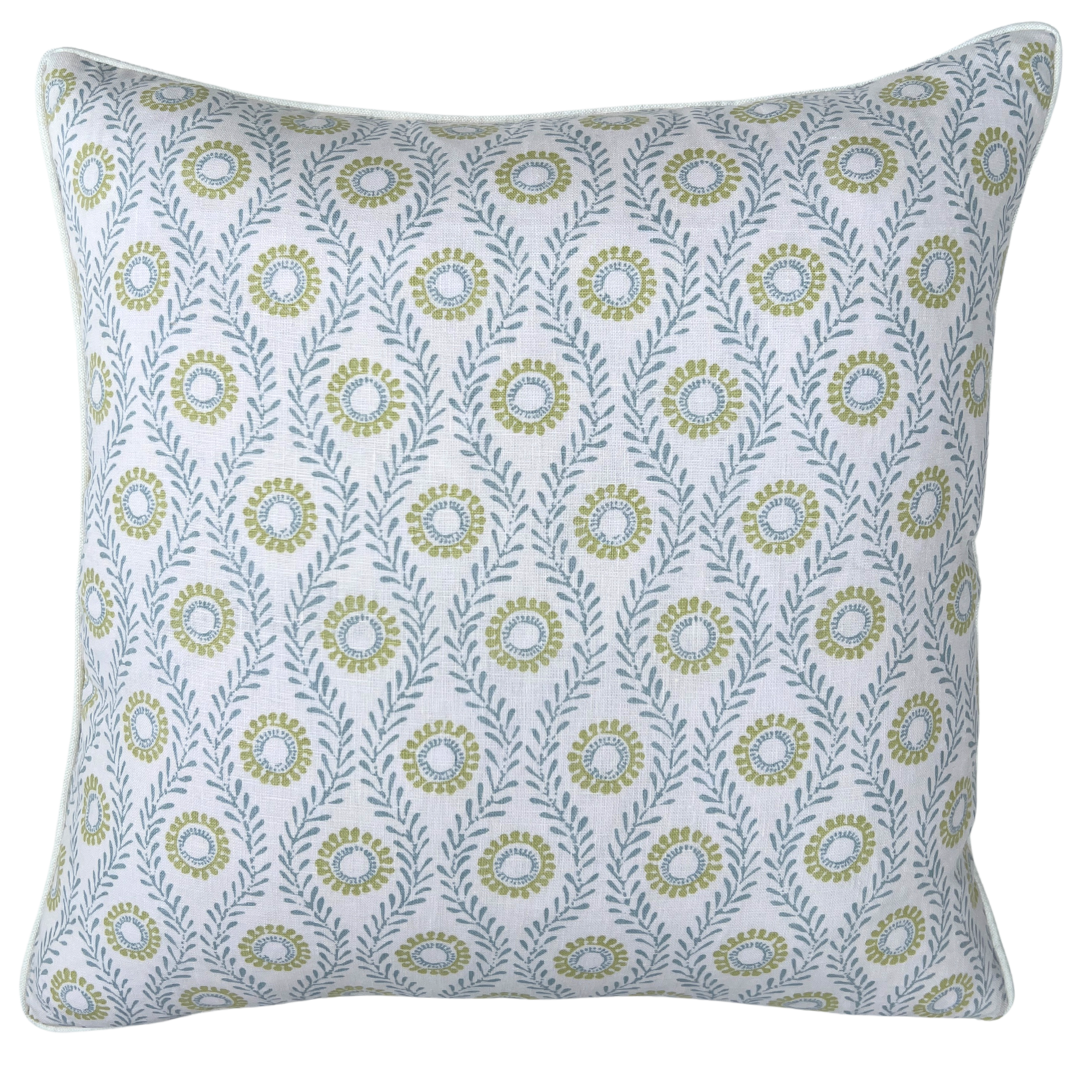 The Francie Pillow features a delicate floral motif in soft blue and green on a crisp white ground. The small repeating pattern adds a light, fresh touch and is a simple way to bring pattern and color to any space. Finished with a coordinating white linen back, cording and hidden zipper. Feather down pillow insert included.