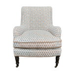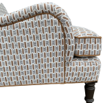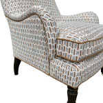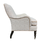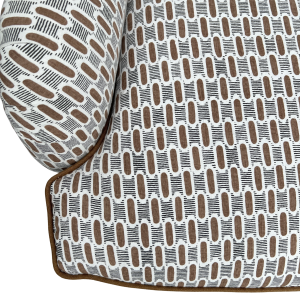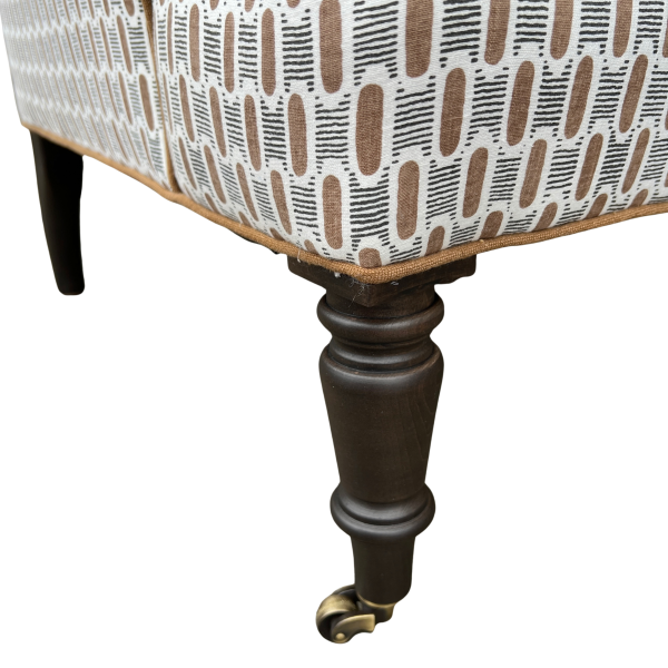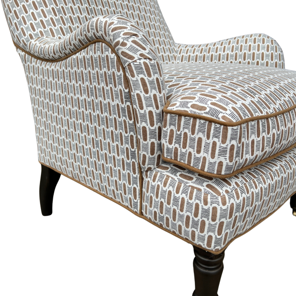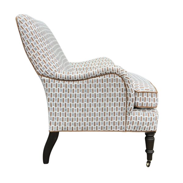 A classic English-style accent chair with timeless charm and tailored detail. Upholstered in a brown and black geometric fabric, the subtle pattern adds interest while still feeling versatile and easy to layer. Coordinating brown welt outlines the frame and seat cushion, giving it a clean, finished look.