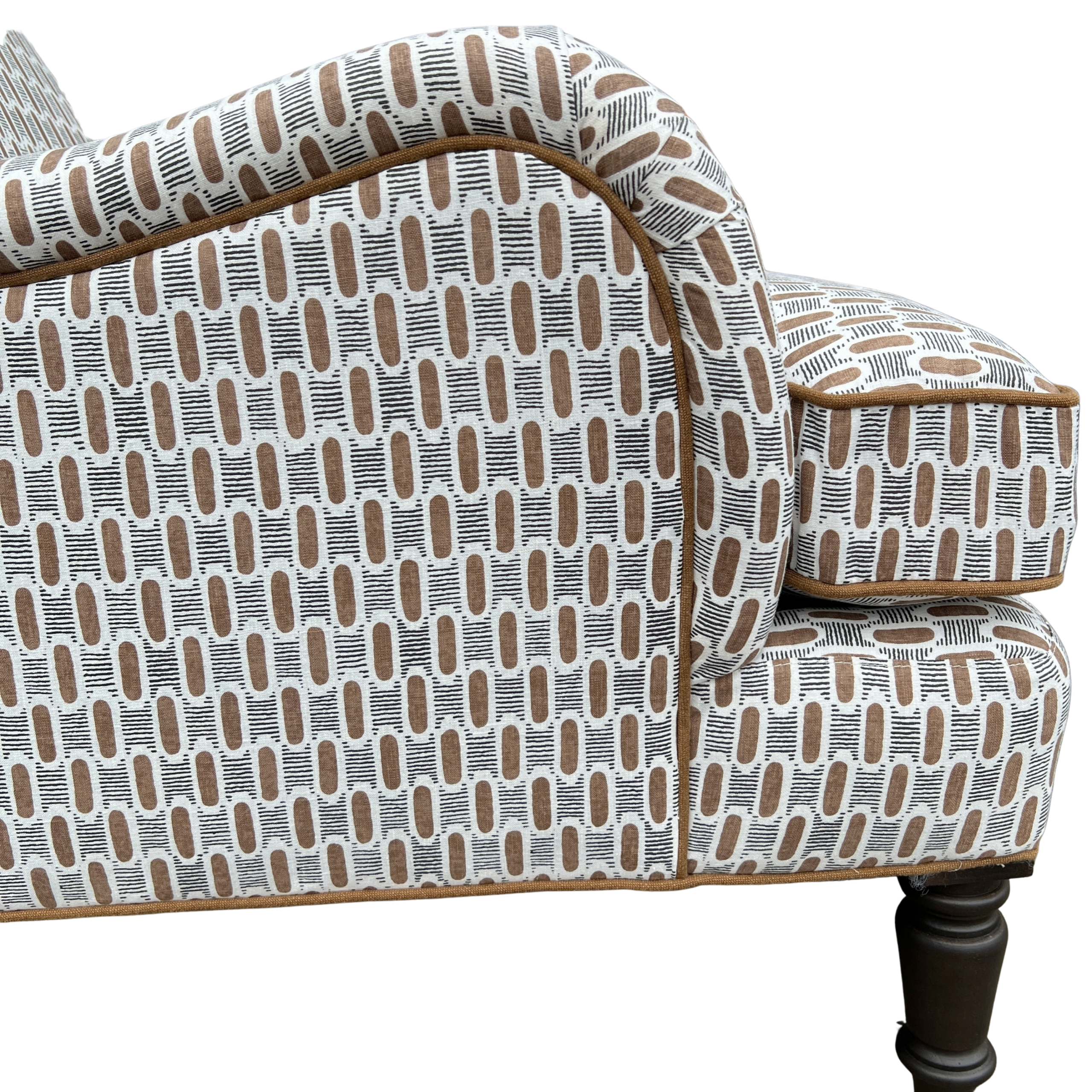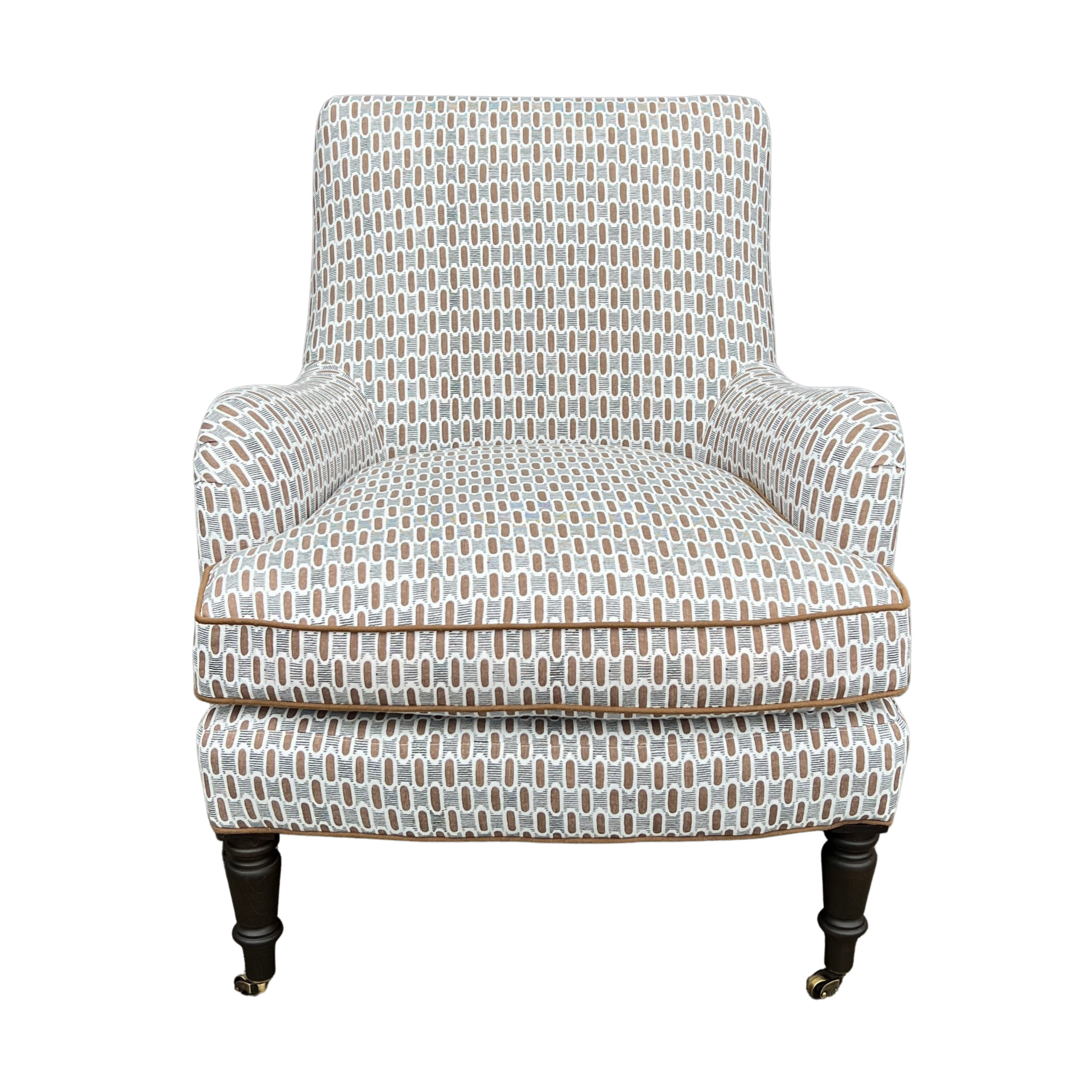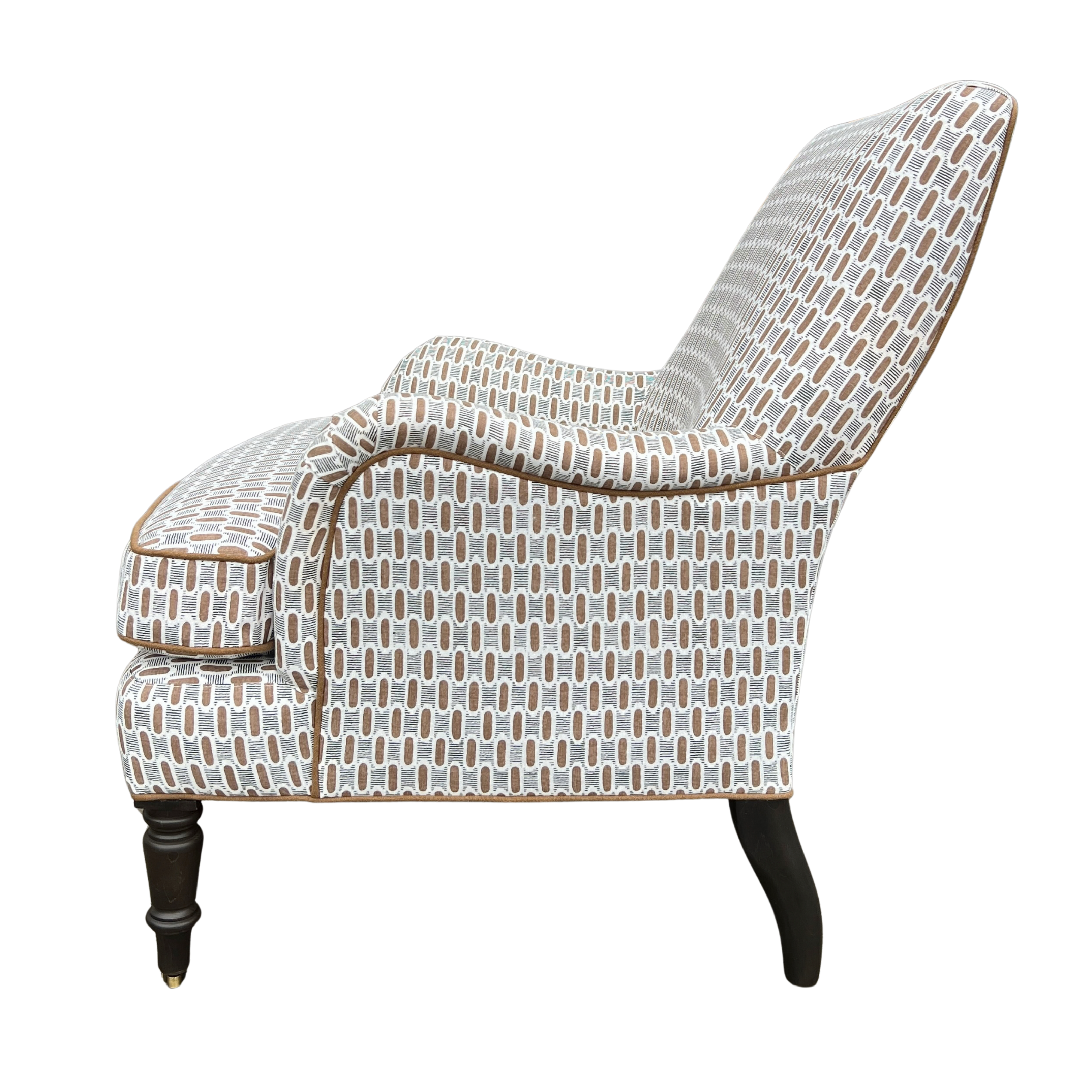 A classic English-style accent chair with timeless charm and tailored detail. Upholstered in a brown and black geometric fabric, the subtle pattern adds interest while still feeling versatile and easy to layer. Coordinating brown welt outlines the frame and seat cushion, giving it a clean, finished look.