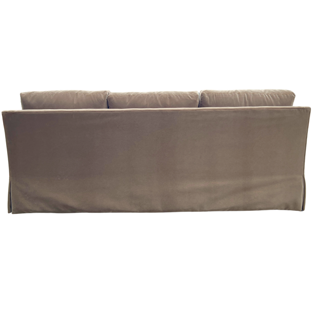 This sofa pairs classic comfort with a tailored silhouette. Gently sloped arms, a deep bench seat, and supportive back cushions create an inviting place to gather, while the dressmaker skirt adds a polished, finished look. Designed for everyday living, it offers generous seating and timeless style that works effortlessly in both relaxed and refined spaces. Upholstered in a caramel-colored performance velvet.