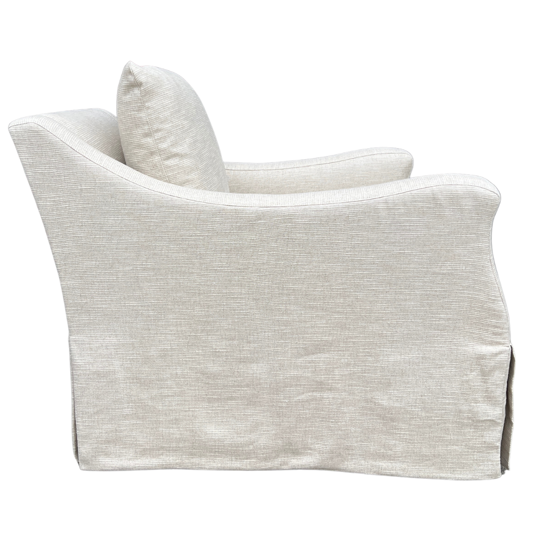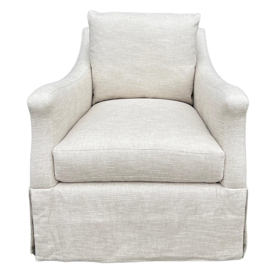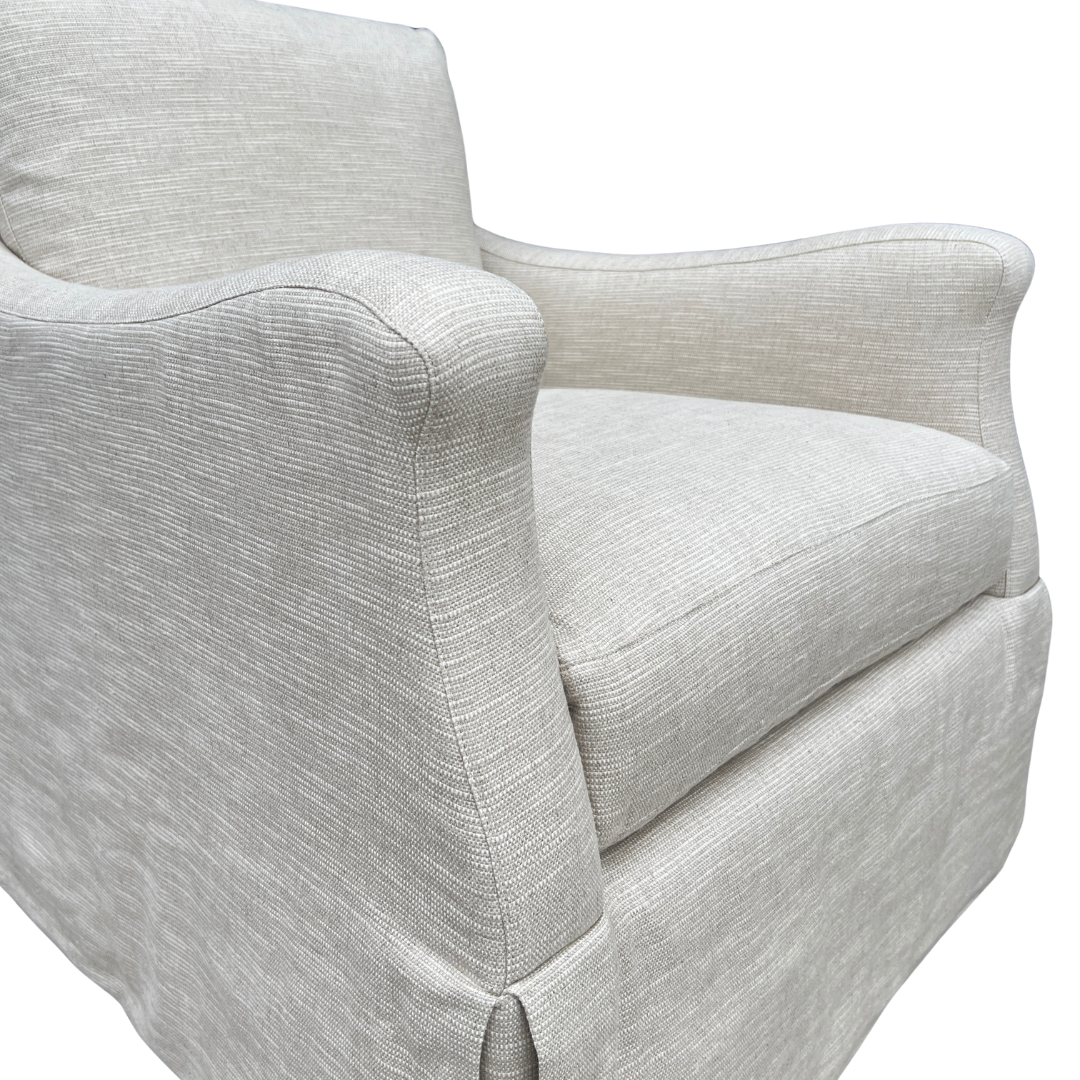 The gently curved arms, plush loose back cushion, and dressmaker skirt make this tailored swivel chair wonderfully stylish from every angle. Perfect for living rooms, bedrooms or reading nooks, this classic style from Lee Industries delivers comfort, versatility and timeless style in one effortless piece. Upholstered in a soft, tonal stripe.