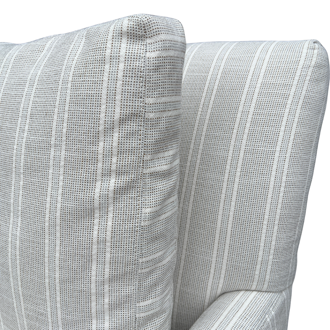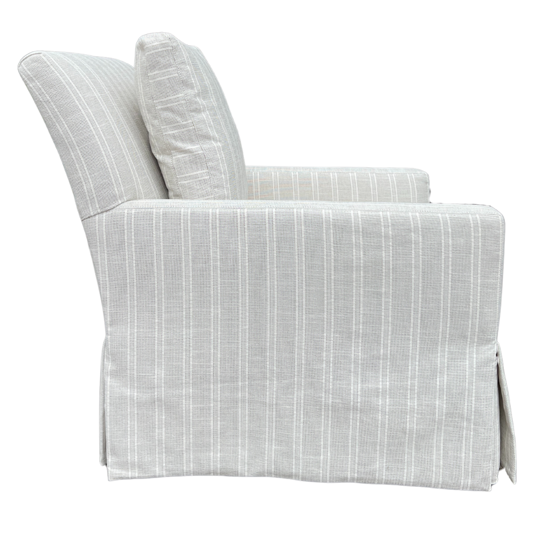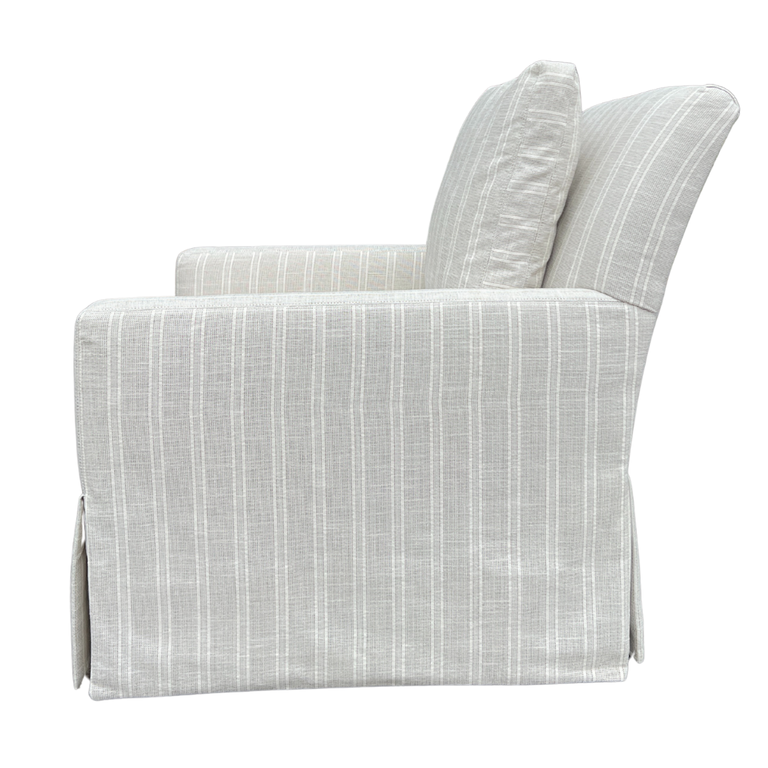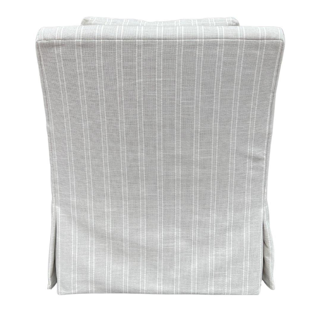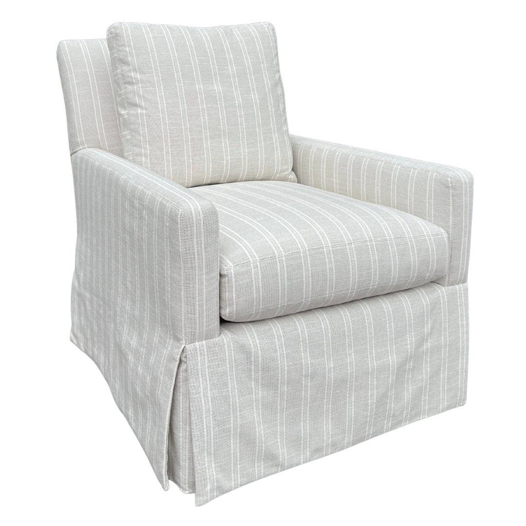 This swivel chair balances modern comfort with classic detail. Clean, tailored lines are softened by gently rolled arms, a deep, inviting seat, and a supportive loose back pillow. A tailored skirt adds a refined finish, giving the chair a polished presence that works beautifully in living rooms, bedrooms, or cozy corners. Designed for everyday comfort with timeless appeal. Upholstered in a soft, neutral stripe with shades of caramel, dove and slate.