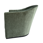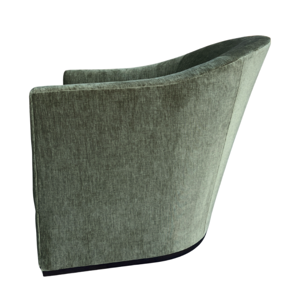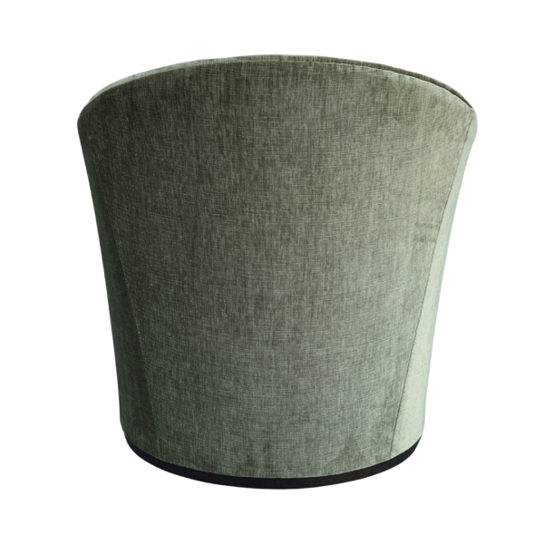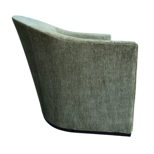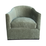 One of our most popular and versatile swivel chairs. This chair has a softly curved back and is trimmed with a small line of wood around its base. A beautiful silhouette from any angle, the size and scale of this chair works well in a living room, family room or bedroom. Upholstered in an earthy green chenille fabric.