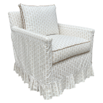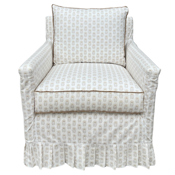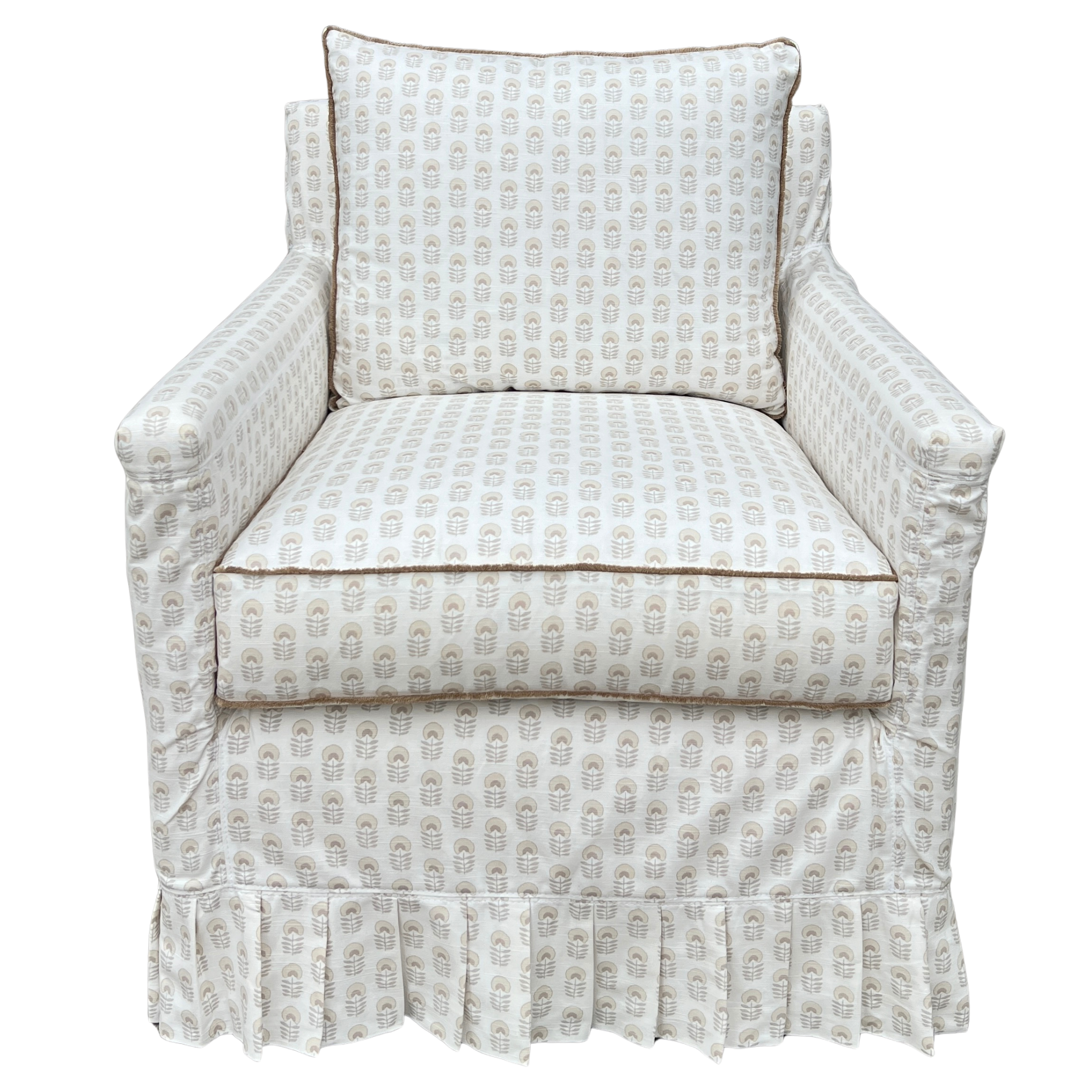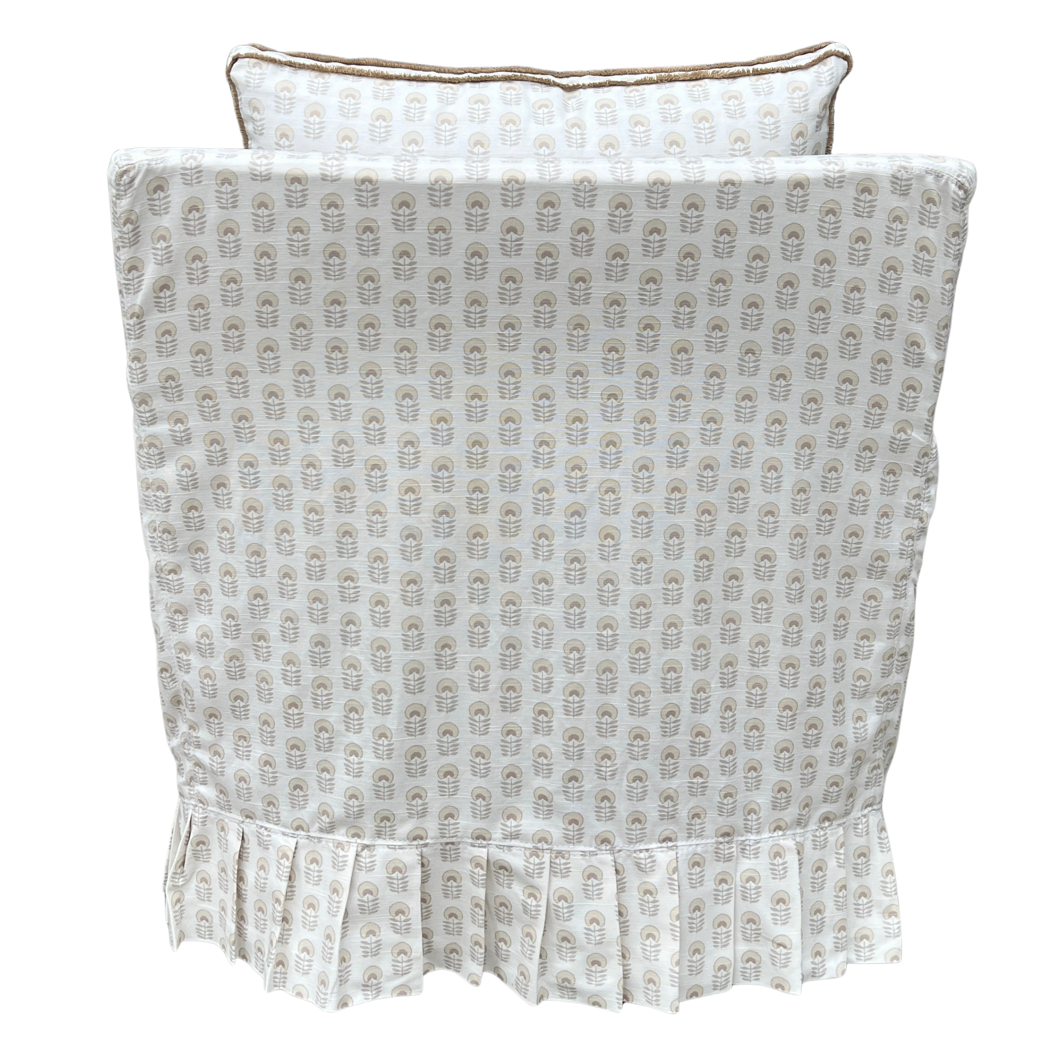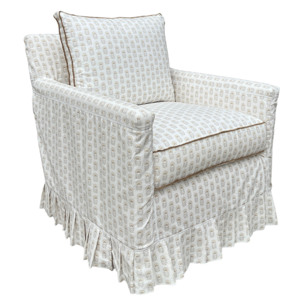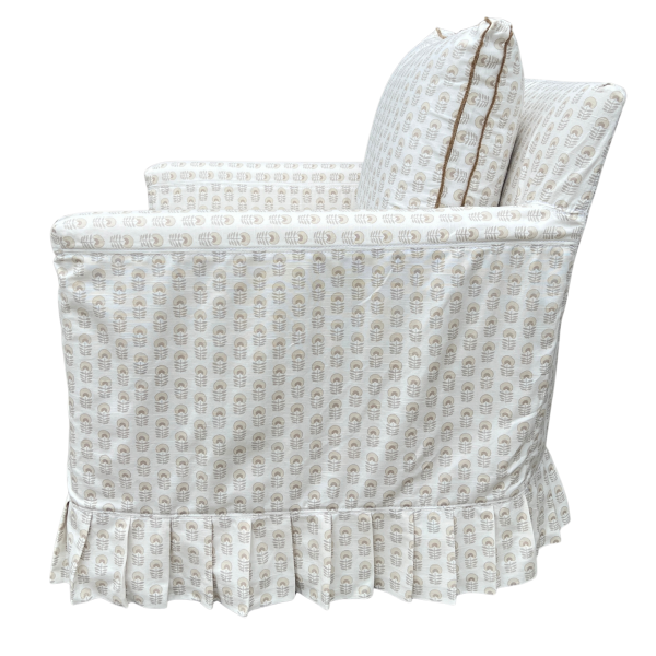 Designed with everyday comfort in mind, this slipcovered swivel chair is made for living. Add a pair to a family room, bedroom, home office, or cozy reading nook – you won’t be able to resist sitting back and relaxing. Custom features include a classic pleated skirt and brown eyelash trim along the back and seat cushion edges. Slipcovered in a neutral floral block print fabric.