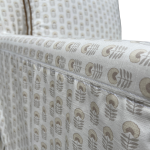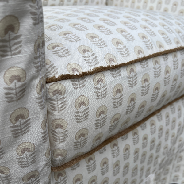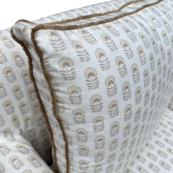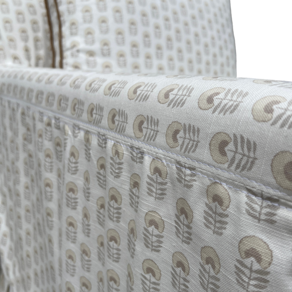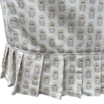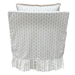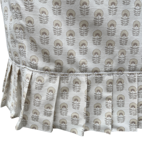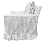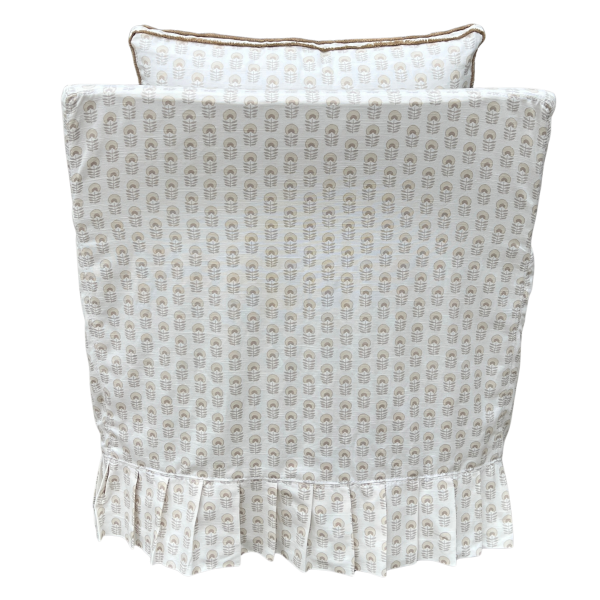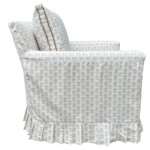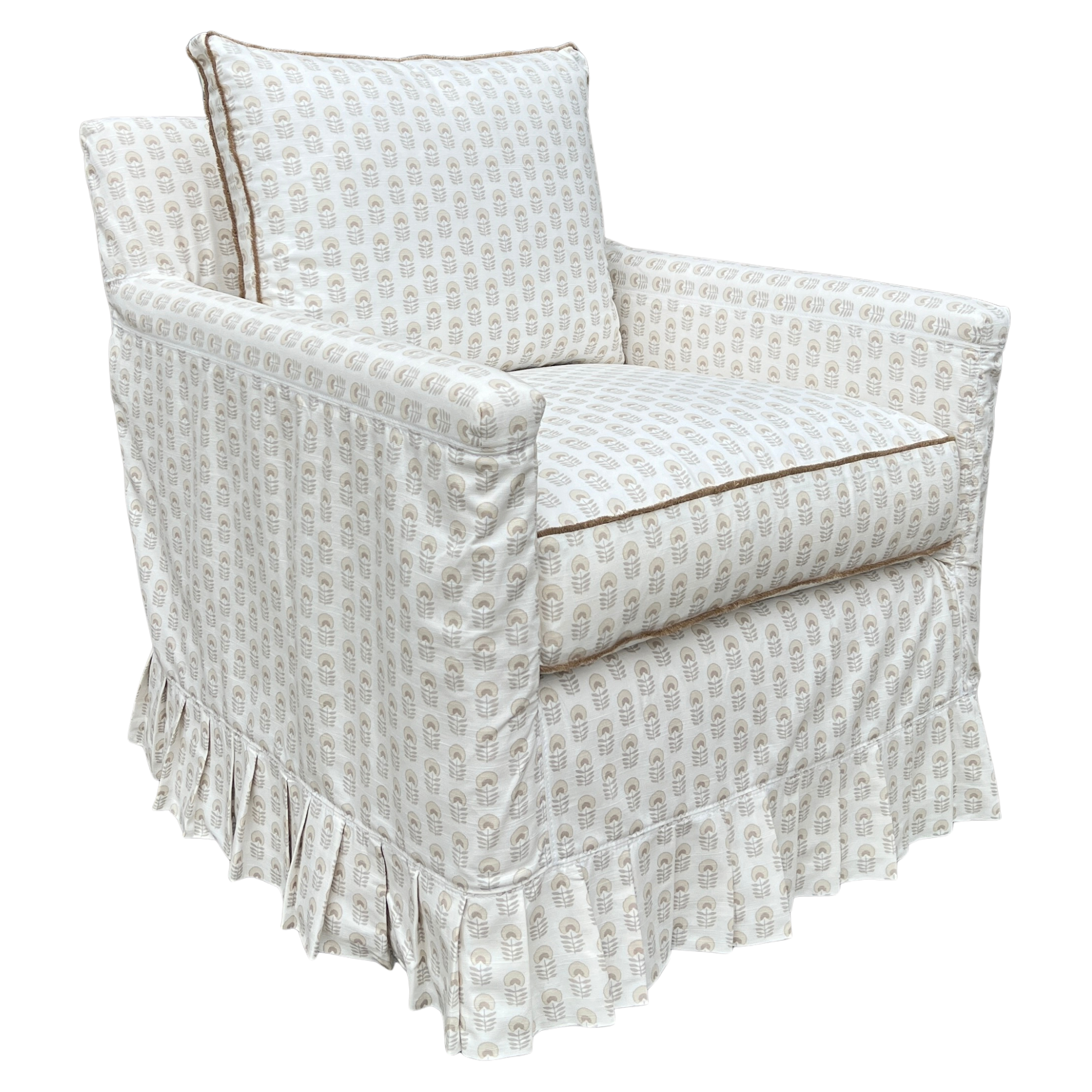 Designed with everyday comfort in mind, this slipcovered swivel chair is made for living. Add a pair to a family room, bedroom, home office, or cozy reading nook – you won’t be able to resist sitting back and relaxing. Custom features include a classic pleated skirt and brown eyelash trim along the back and seat cushion edges. Slipcovered in a neutral floral block print fabric.