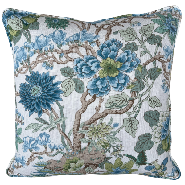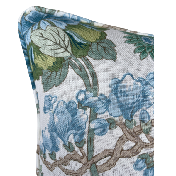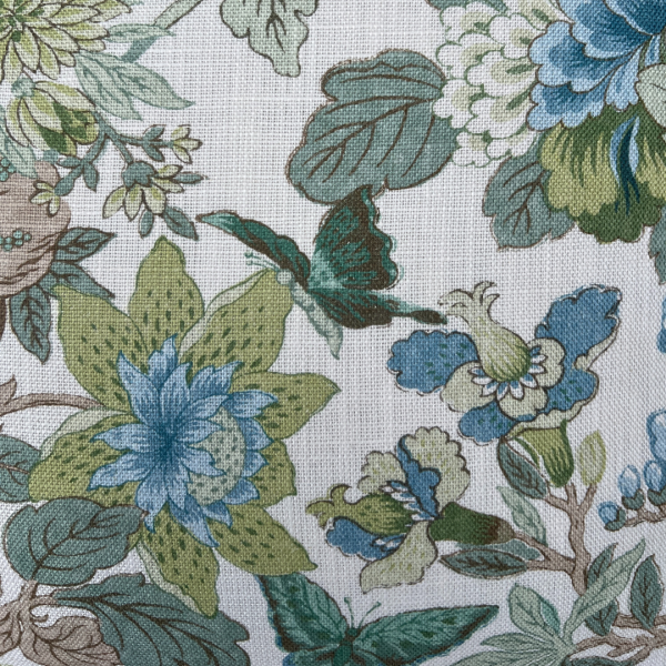 The Molly Pillow brings a playful burst of color to your space with layered florals in shades of blue, green, and soft brown on a crisp white ground. Butterflies dance between blossoms and leafy vines, giving this print a lively, storybook charm. Whether layered on a sofa, tucked into a reading nook, or styled on a bed, it’s the perfect pop of pattern and color. Finished with self-cording and hidden zipper. Feather down pillow insert included.
