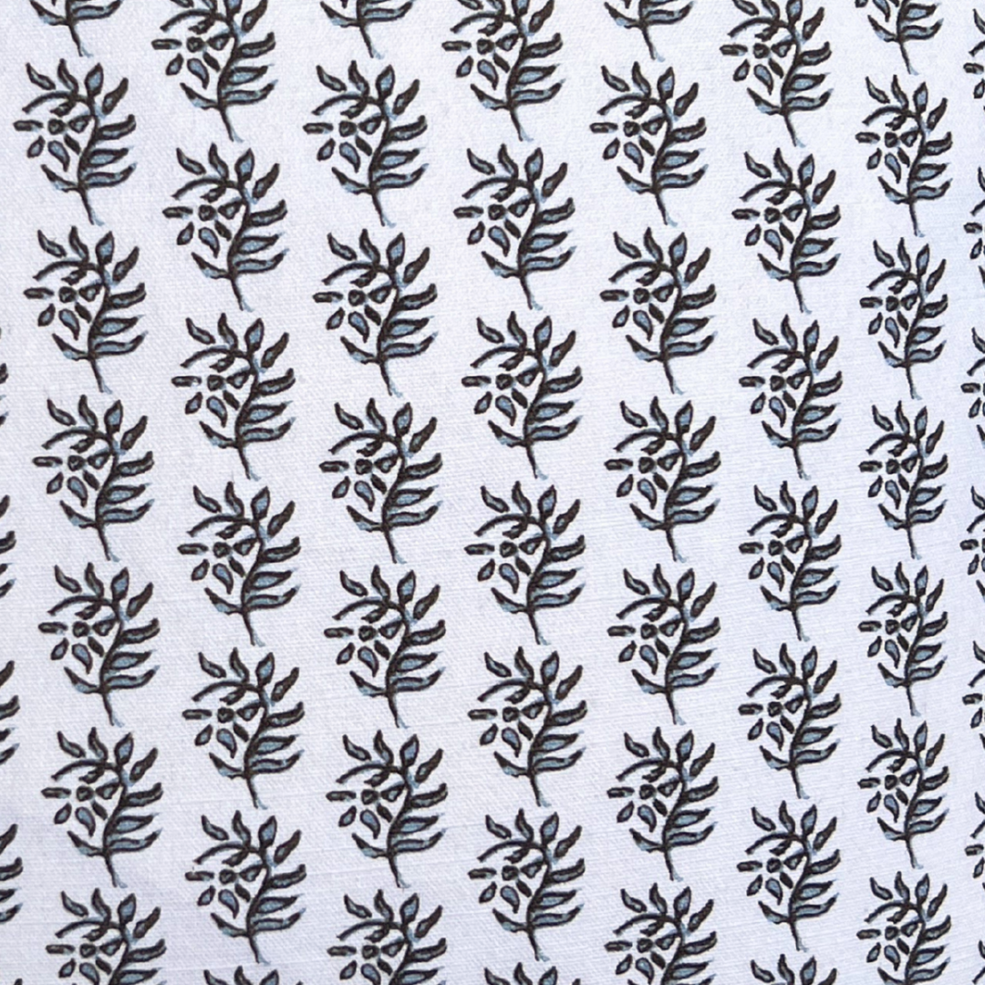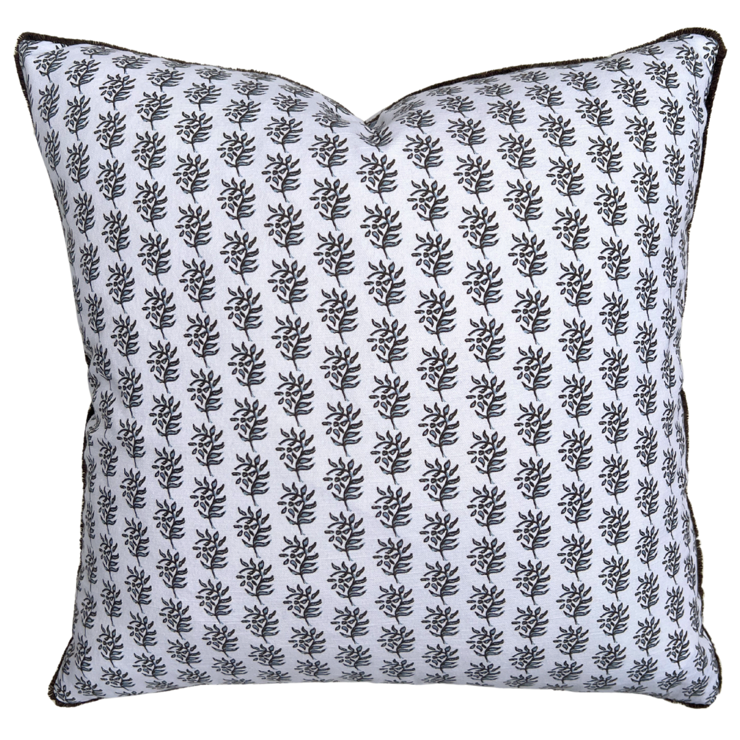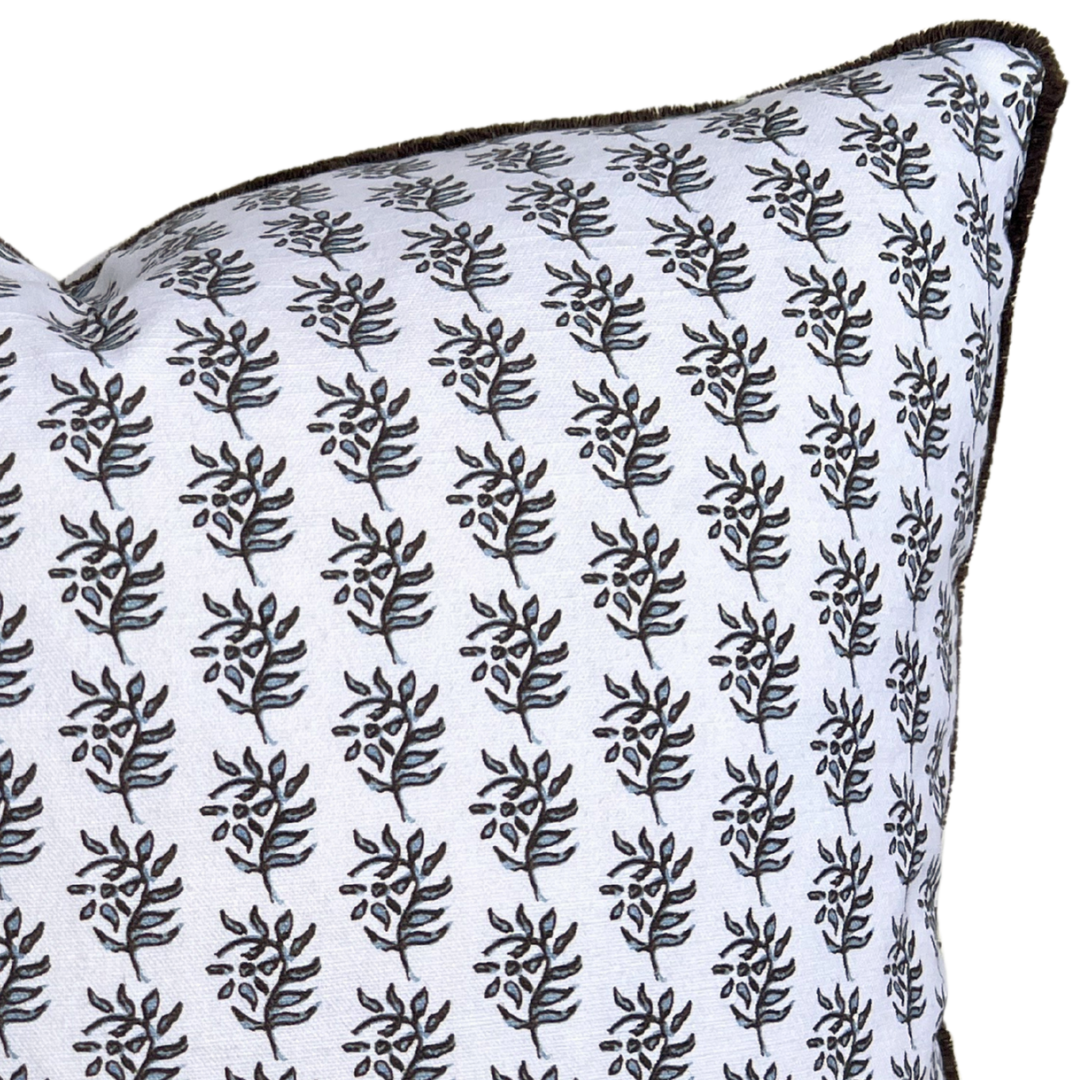 The Quinn Pillow features a small hand-blocked floral print in brown and soft blue on a white ground. Finished with a coordinating brown eyelash trim along the edges, it adds a tailored, textural touch to your mix of patterns and solids. Feather down pillow insert included.